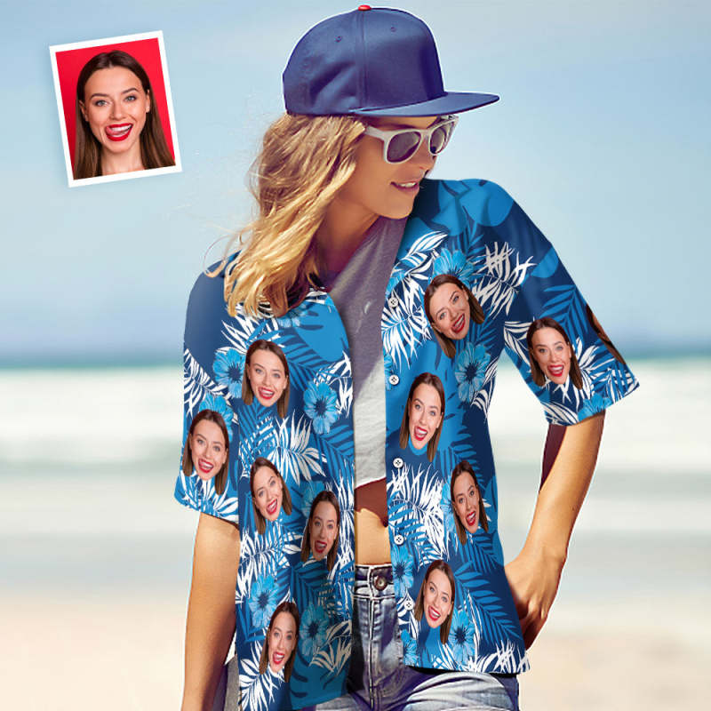 Custom Face Hawaiian Shirt Women's All Over Print Blue Short Sleeve Shirt