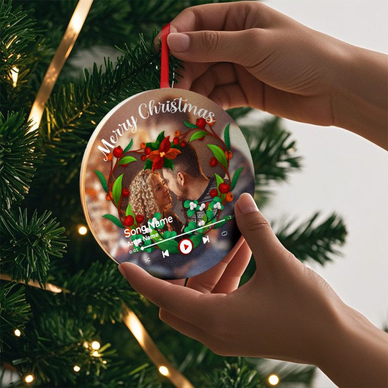 Music and Photo Christmas Ornament - Celebrate precious memories with our customisable round photo Christmas ornament, designed to capture the magic of the season.
